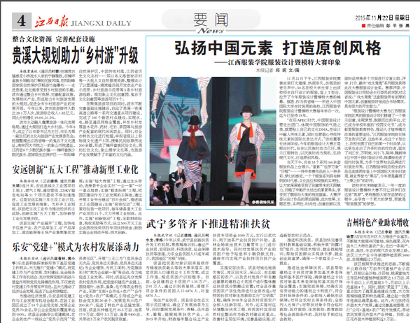 服装报讯(明海 记者/李凡通 实习记者/杜佳琪 江倩 ) 11月21日下午2点,江西服装学院一年一度的大型赛事润华奖服装设计暨模特大赛进入最后的比拼。最终,来自服装工程分院12服工本科实验班宋晓敏、姚芳设计的服装成衣作品《戏水鸳鸯》获得本届润华奖服装设计大赛金奖。来自14表演专科班郝云鹏和15模特专科班李林分获模特大赛男、女冠军。