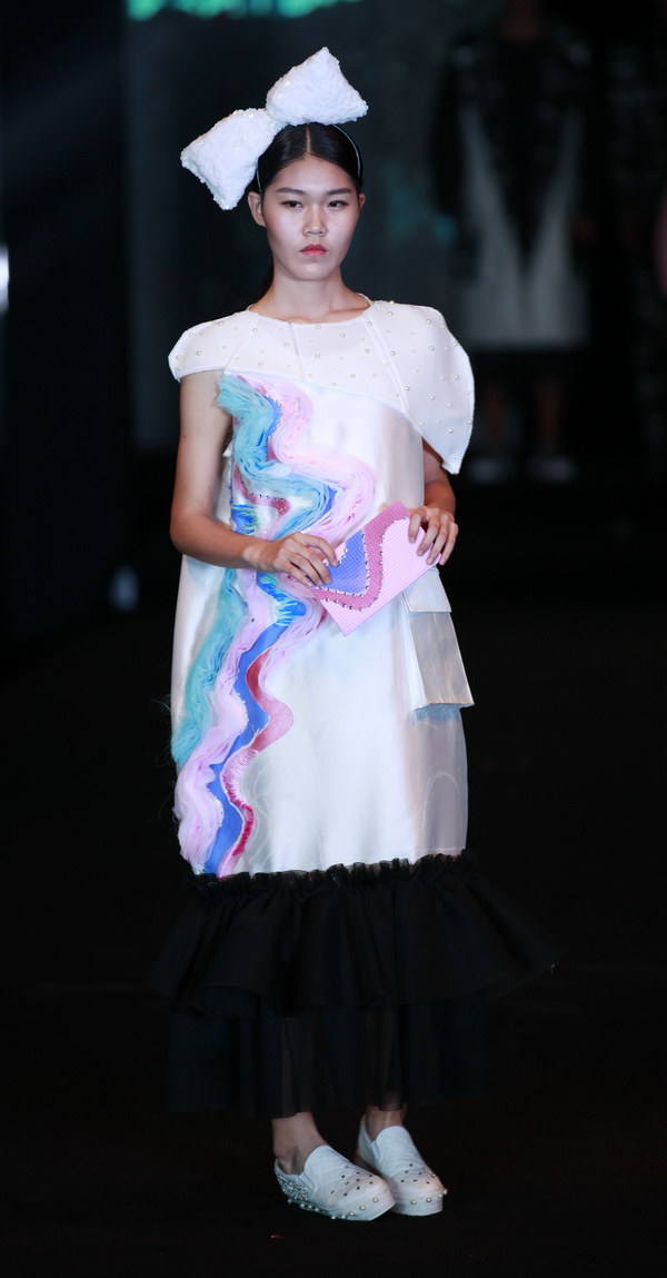 本届大赛共收到设计画稿1028件。通过专家评审组认真仔细的初选和复选,最终有33个系列166余套服装作品进入总决赛,角逐金、银、铜奖。比赛现场流光溢彩,霓裳艳影,“门前故事”“轻松·旋律”“影影布息”“胡同记忆”“东方韵”……一件件设计新颖的参赛作品,在中国古风韵味十足的音乐声中,模特们身着设计师灵感和汗水的结晶走上T台,给人一种多彩、梦幻的感觉,一个个服装系列具有鲜明的时代感、文化品位和较强的实用性,让大家深深感受到了创意带来的无限魅力,目睹了辛勤汗水结出的累累果实,享受到了靓丽与大美的视觉盛宴。二号作品《戏水鸳鸯》这套服装整体充满着的欢快感,服装将女孩子的甜美、天真、浪漫都展现的非常到位。最终,来自服装工程分院12服工本科实验班宋晓敏、姚芳设计的服装成衣作品《戏水鸳鸯》凭借用色大胆、构思精巧新颖成功问鼎本届大赛金奖和“最佳服饰搭配奖”。来自时装设计分院13级培优班丁一设计的作品《局》获得银奖和“最具市场潜力奖”。来自服装设计与管理分院13级服设11班陈珍设计的作品《幽山夕梦》和13级服设19班张越洋设计的作品《门前故事》获得银奖。来自时装设计分院13培优班雷昕月设计的作品《影影布息》、服装工程分院12本科实验班廖艺丁设计的作品《Miss fan》、时装设计分院13级服艺2班黄湘汝 罗春兰设计的作品《融》获得铜奖。来自设计分院12服艺本科2班韦艳梅设计的作品《轻松·旋律》获得铜奖和“最佳工艺奖”。