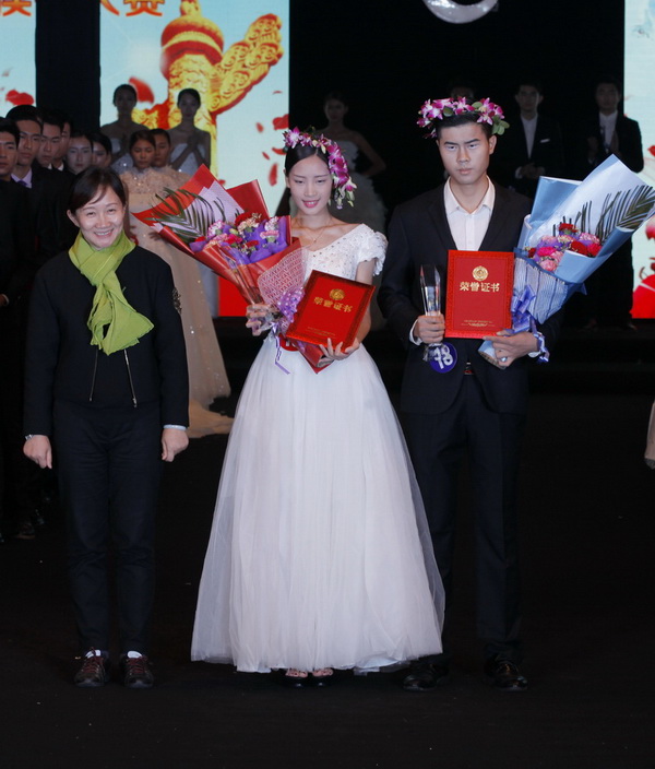武汉纺织大学服装学院副院长袁大鹏为服装设计大赛冠军颁奖合影